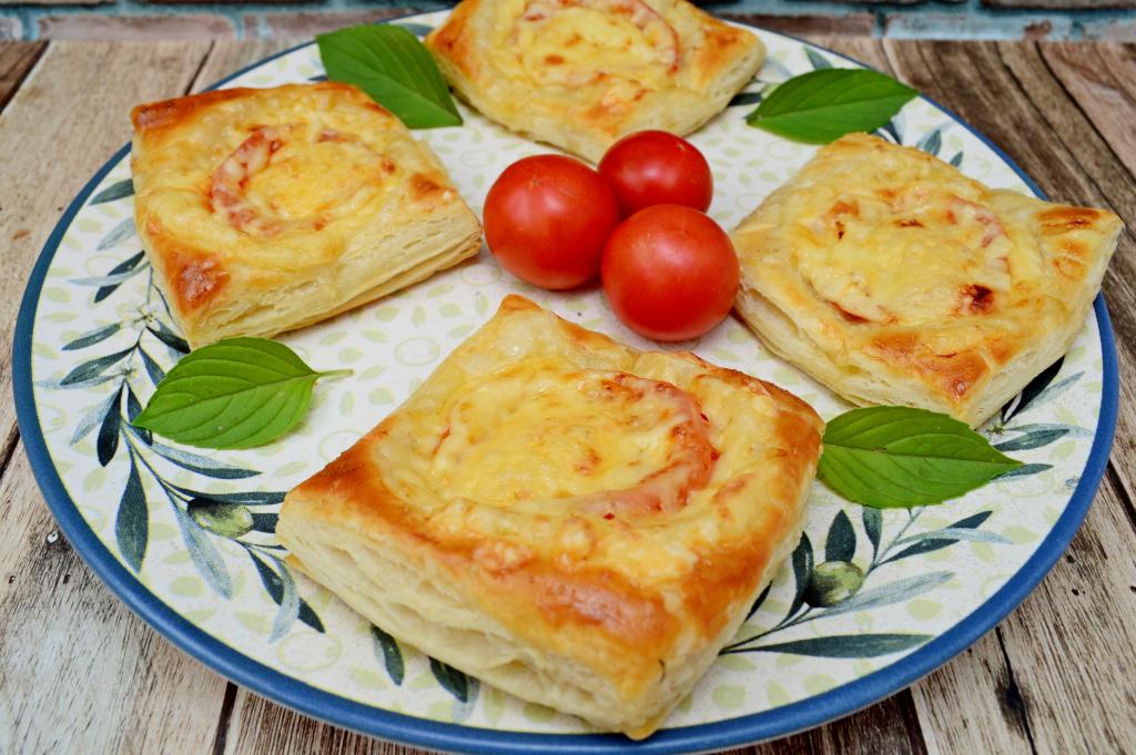 Достать готовую выпечку из духовки, дать немного остыть и подавать к столу. Уверена, хрустящие слойки с сочным помидором и расплавленным сыром понравятся многим!