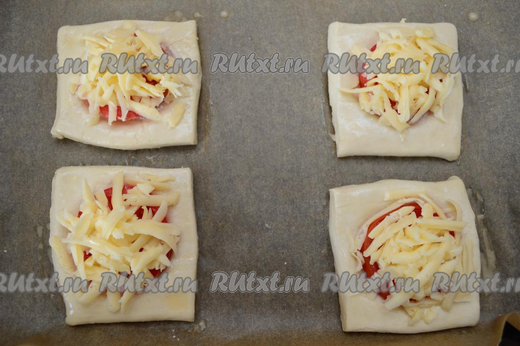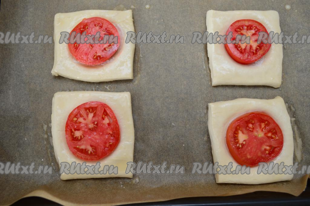 В небольшой ёмкости до однородности взбить вилкой яйцо. Смазать поверхность теста каждой слойки взбитым яйцом. Сверху присыпать помидоры натёртым сыром.