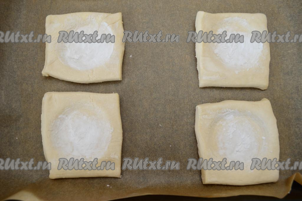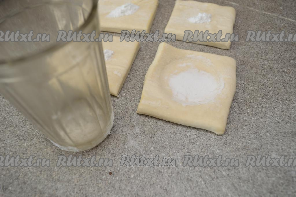 В середину каждого квадратика выложить примерно 1/4 чайной ложки крахмала. При помощи обычного гранёного стакана сделать углубление в середине квадрата из слоёного теста, плотно прижав к тесту дно стакана и повращав его немного влево-вправо.