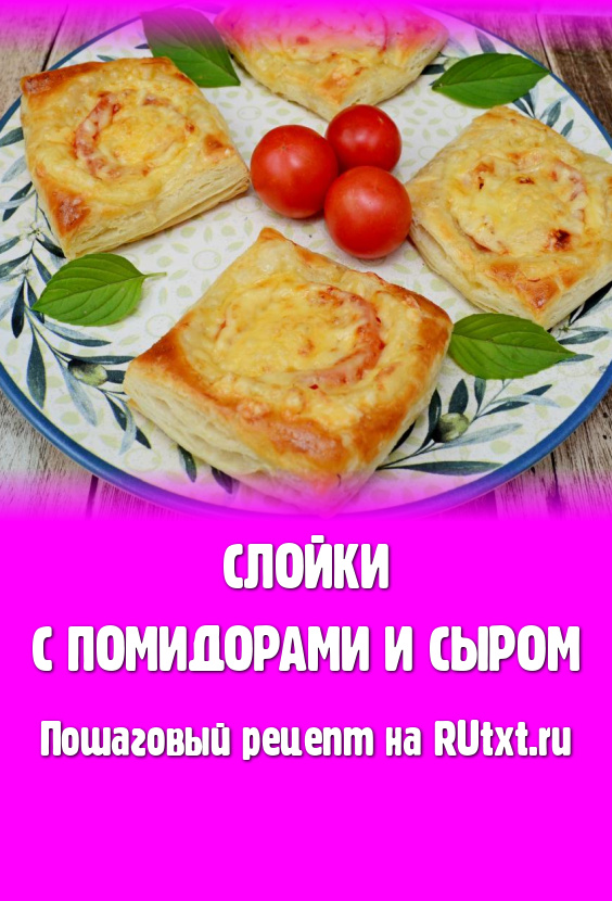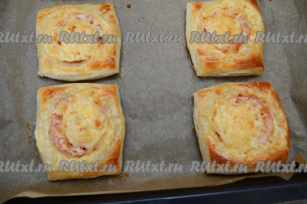 Слойки с помидорами и сыром выпекать в духовке, заранее прогретой до 200 градусов, 20-25 минут (до подрумянивания слоёного теста).