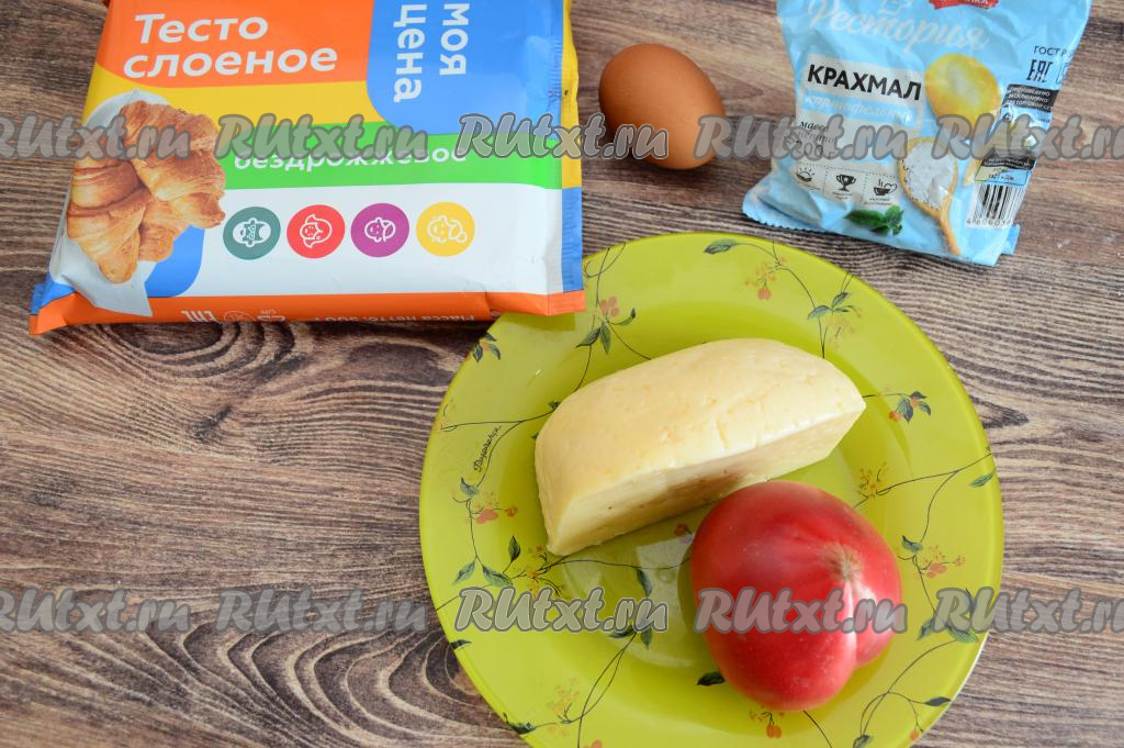 Подготовить продукты. Разморозить слоёное тесто при комнатной температуре. Для этой выпечки отлично подойдёт как бездрожжевое, так и дрожжевое слоёное тесто. Сыр лучше брать твёрдых сортов. Помидор нужен плотный, который хорошо режется на кружочки.