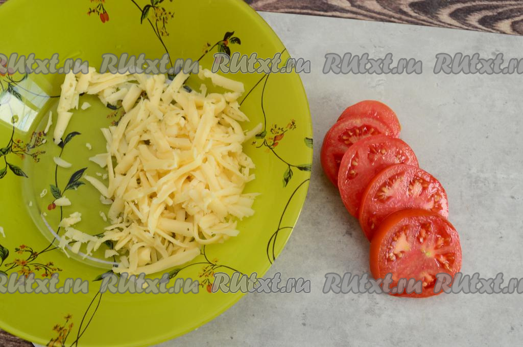 Помидор вымыть, обсушить, нарезать на кружочки. Сыр натереть на крупной тёрке.