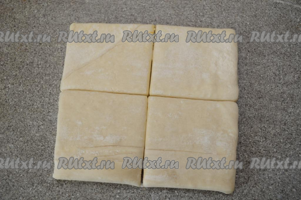 Разрезать пласт слоёного теста на 4 квадрата.