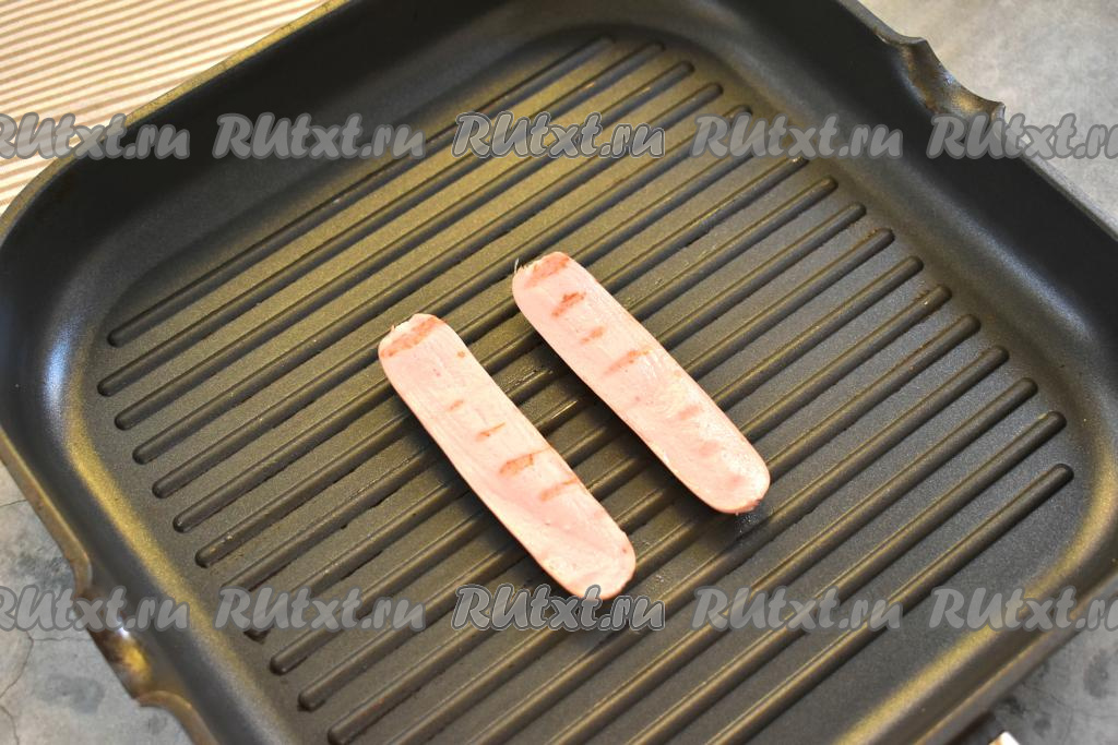 Очищаем сосиску от оболочки. Разрезам сосиску вдоль на 2 половинки. Сковороду (у меня - сковорода гриль) слегка смазываем растительным маслом и разогреваем. Половинки сосиски выкладываем на сковороду и подрумяниваем с двух сторон (примерно по 1,5 минуты с каждой стороны) на среднем огне.