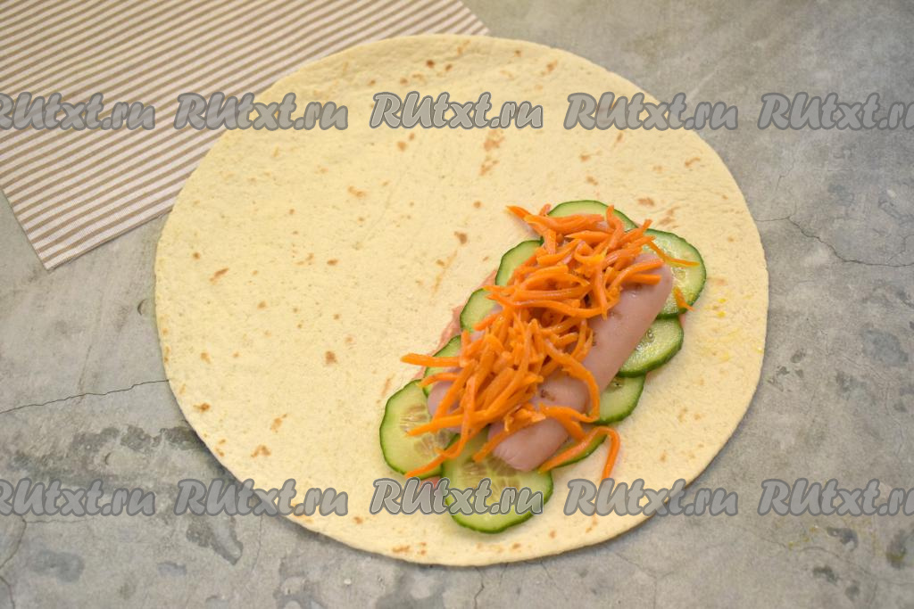 На смазанную часть лепёшки выкладываем огурец, нарезанный на тонкие кружочки. По желанию, огурчики можно немного посолить.