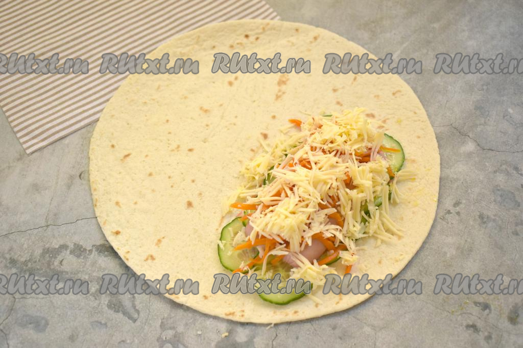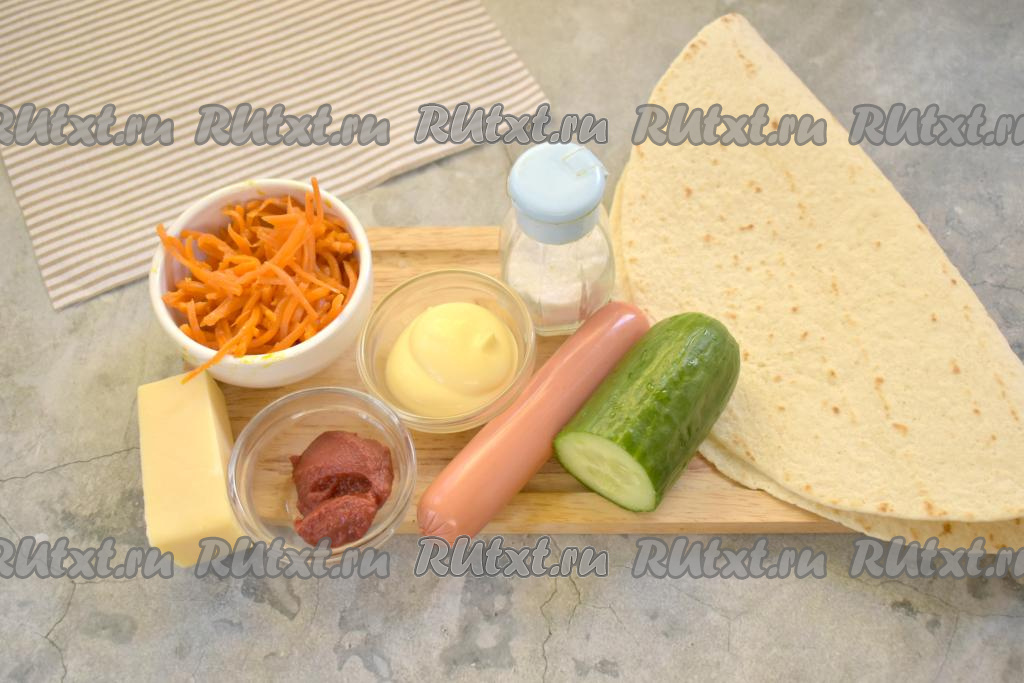 Вот такие продукты нужны для 1 порции хот-дога в тортилье.