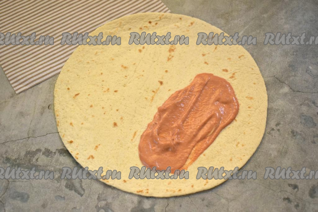 В маленькую миску кладём майонез, добавляем томатный соус (или кетчуп), перемешиваем. Раскладываем на столе тортилью. Визуально делим эту лепёшку на 2 половинки. На одну половину лепёшки, отступив от краёв, выкладываем смесь томатного соуса и майонеза и немного размазываем, как на фото.
