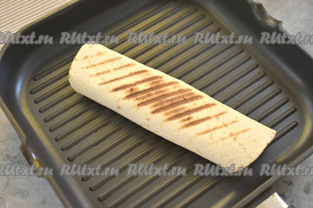 Сворачиваем лепёшку в рулет, начиная со стороны с начинкой. Выкладываем хот-дог в тортилье на хорошо разогретую сковороду и поджариваем до подрумянивания с двух сторон (примерно по 1,5-2 минуты с каждой стороны).