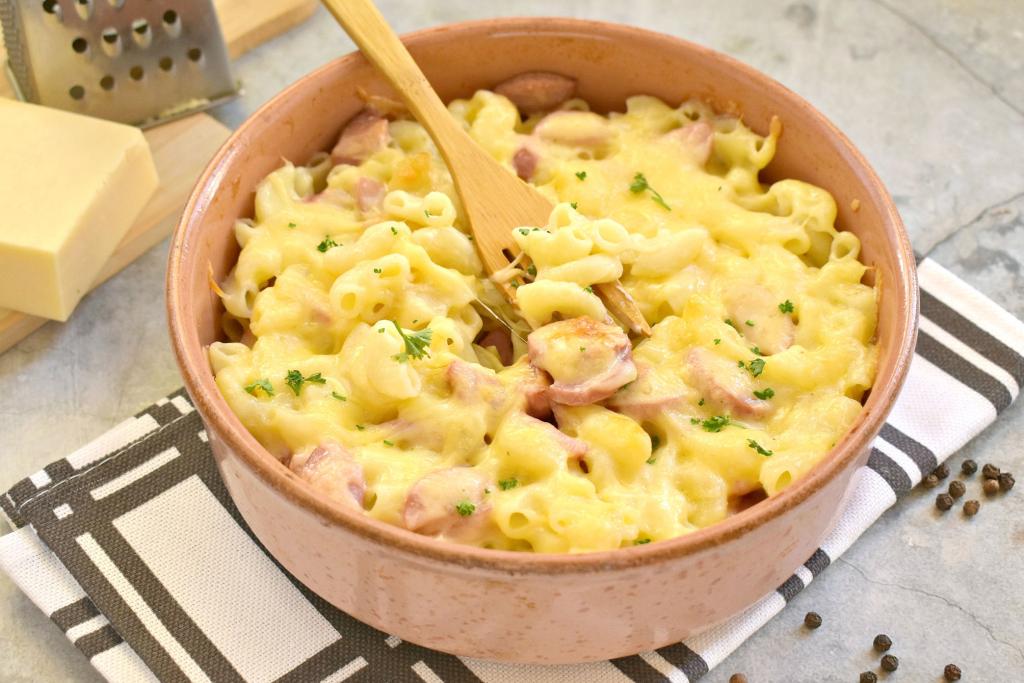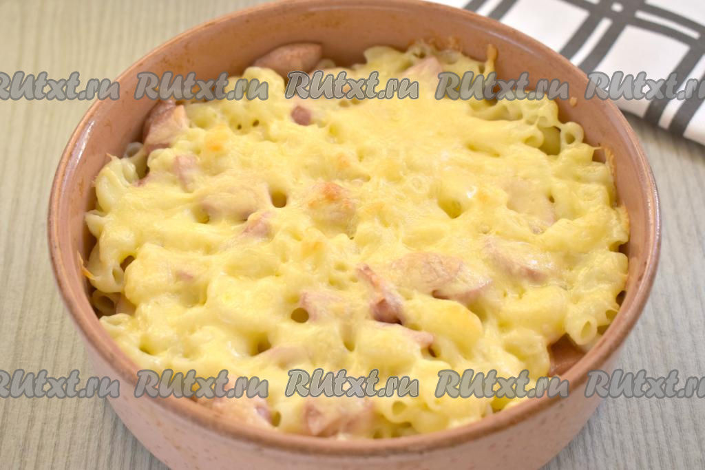 Отправляем форму с макаронами и сосисками под сыром в духовку, прогретую до 180 градусов. Запекаем 10 минут (до расплавления сыра).
