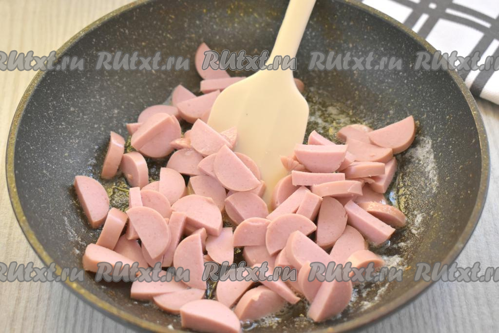 Пока варятся макароны, очищаем сосиски от оболочки, нарезаем на нетолстые полукружочки. Растапливаем в сковороде сливочное масло, затем выкладываем нарезанные сосиски и обжариваем их до румяной корочки со всех сторон на среднем огне, периодически перемешивая.