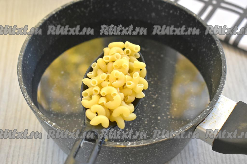 В кастрюлю наливаем примерно 1,5 литра воды, ставим на огонь. Закипевшую воду солим по вкусу, добавляем макароны, перемешиваем, ещё раз даём воде закипеть. После этого варим макароны до готовности.