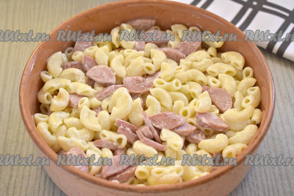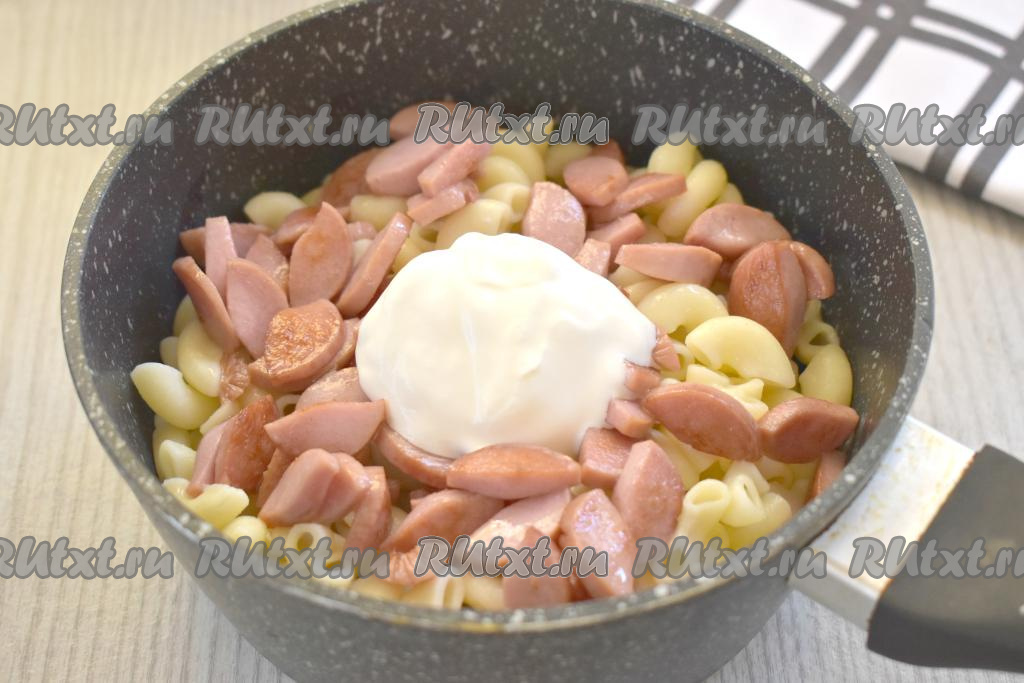 Макароны, сваренные до готовности, откидываем на дуршлаг, лишней воде даём стечь. Перекладываем макароны из дуршлага в кастрюлю, добавляем обжаренные сосиски и сметану, перемешиваем.
