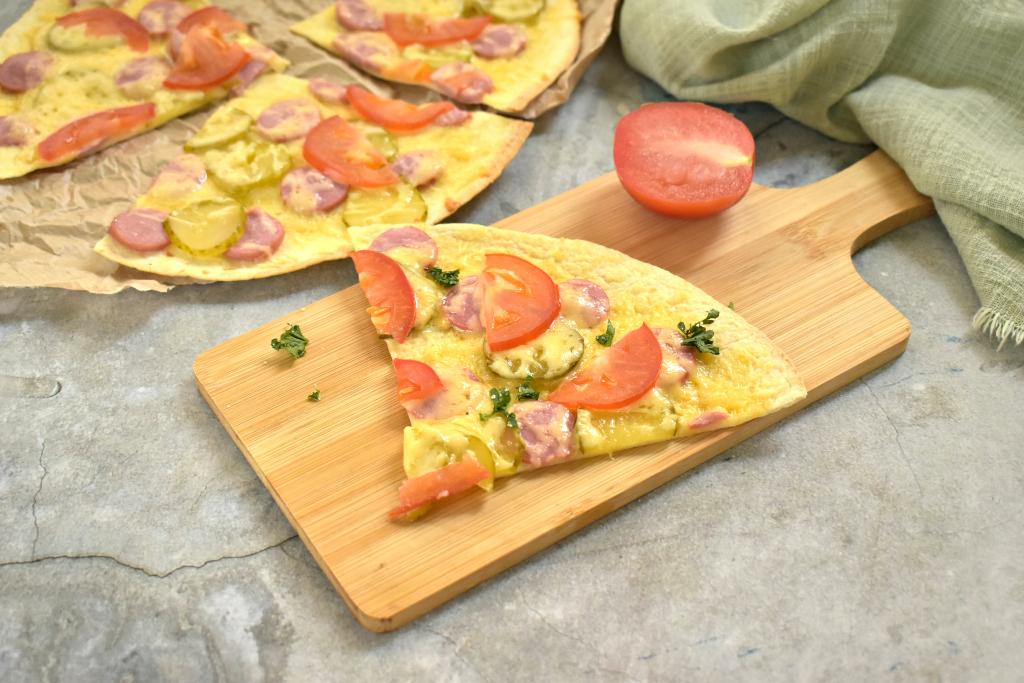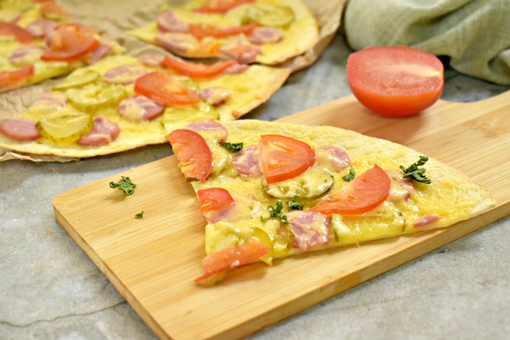 Я часто готовлю пиццу для своей семьи по разным рецептам. Но на работу с тестом всегда требуется время. В этот раз решила приготовить аппетитную, вкусную пиццу за считанные минуты, использовав в качестве её основы покупную пшеничную лепёшку "Тортилью". Начинка для такой пиццы может быть любой. Я решила использовать вполне доступные продукты: сосиску, помидор, солёный огурец и твёрдый сыр. Сытно, просто и вкусно, попробуйте!
