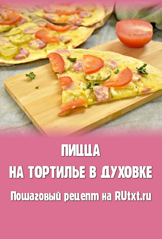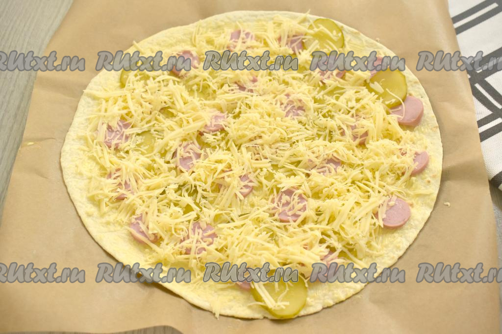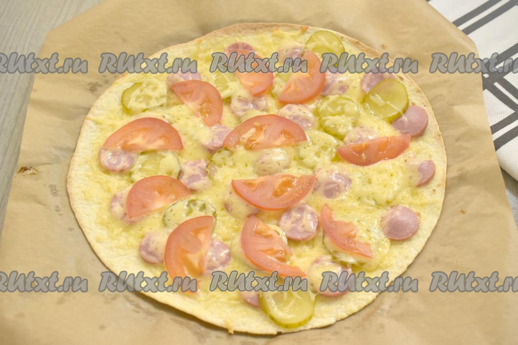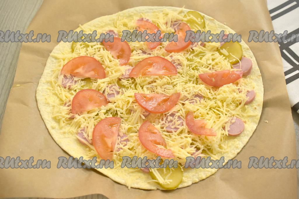 Отправляем противень с пиццей на тортилье в разогретую духовку, запекаем 5-10 минут (до расплавления сыра) при температуре 190 градусов.