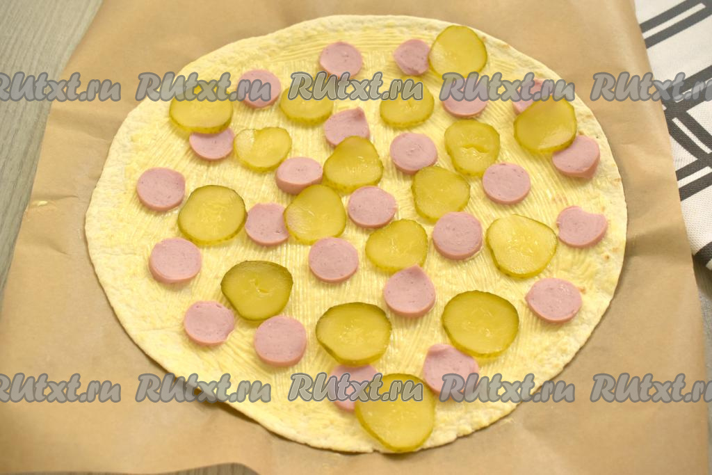 Очищаем сосиску от оболочки. При желании сосиску предварительно можно отварить. Нарезаем сосиску на тонкие кружочки и раскладываем их по смазанной тортилье.