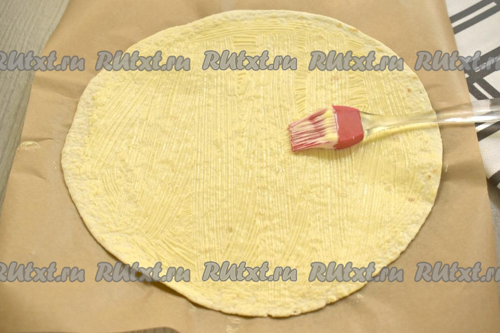 Сразу включаем духовку и выставляем температурный режим на 190 градусов. На противень, застеленный пергаментом для выпечки, кладём тортилью. Смазываем лепёшку майонезом, немного отступая от краёв тортильи.