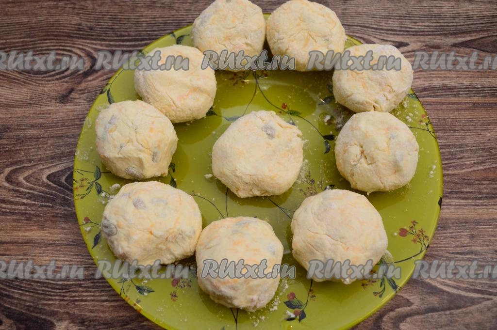 Таким образом постепенно влажными руками формируем все 10 заготовок сырников с тыквой и изюмом, не забывая обваливать их в муке со всех сторон.