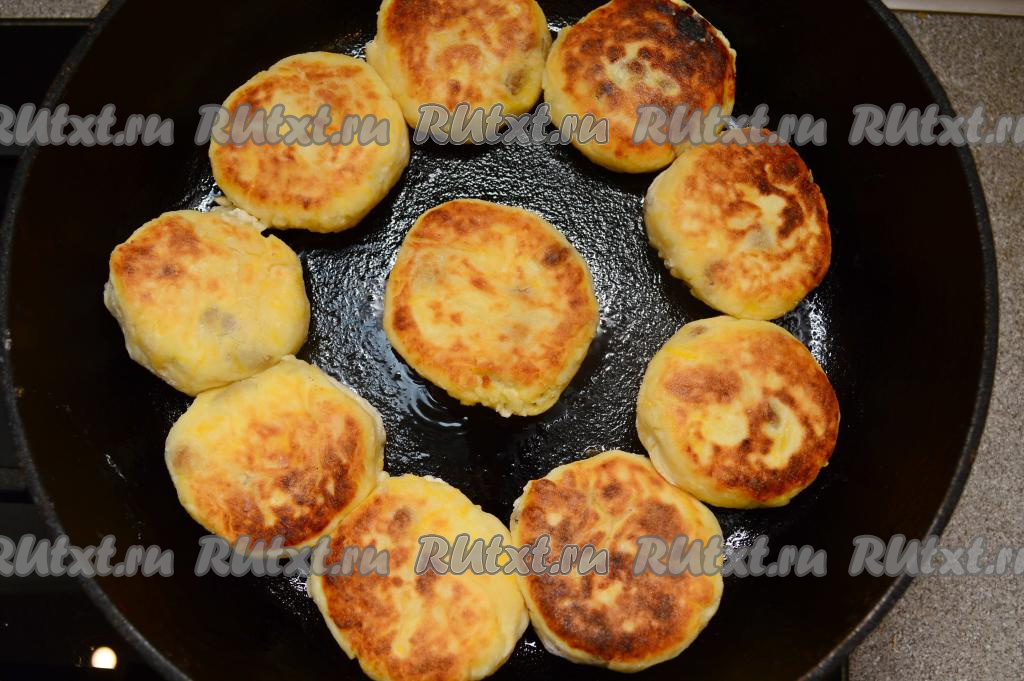 Затем сырники переворачиваем, немного уменьшаем огонь и жарим ещё минуты 3 (тоже до румяной корочки снизу), накрыв сковороду крышкой.