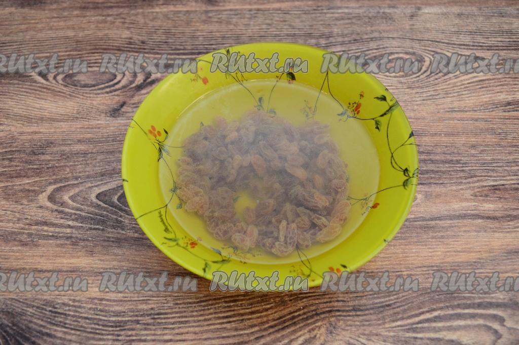 Первым делом нужно запарить изюм. Для этого выкладываем изюм в глубокую тарелку, полностью заливаем кипятком и отставляем минут на 5.