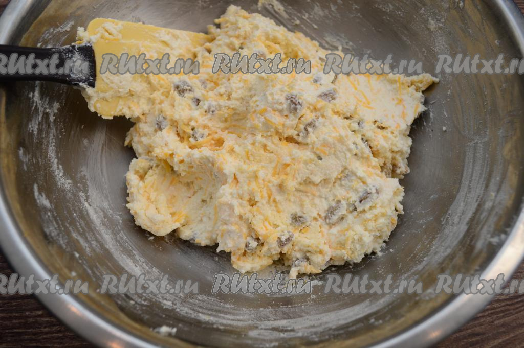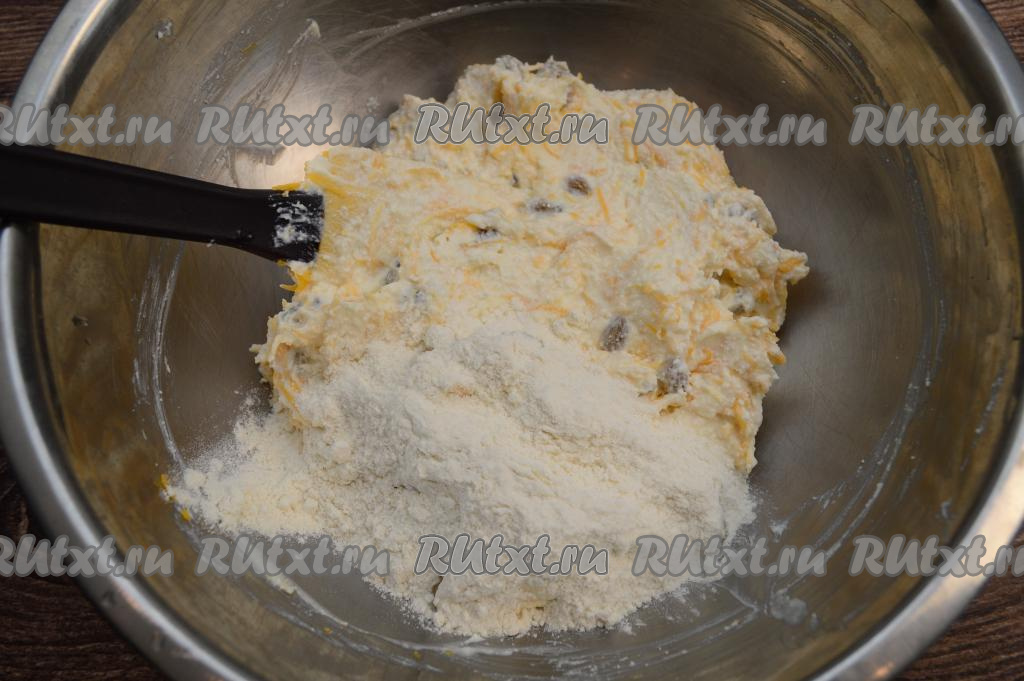 Смешиваем творожную массу с натёртой тыквой и изюмом до однородности. Всыпаем в миску около 40 грамм муки, вмешиваем муку в творожное тесто.
