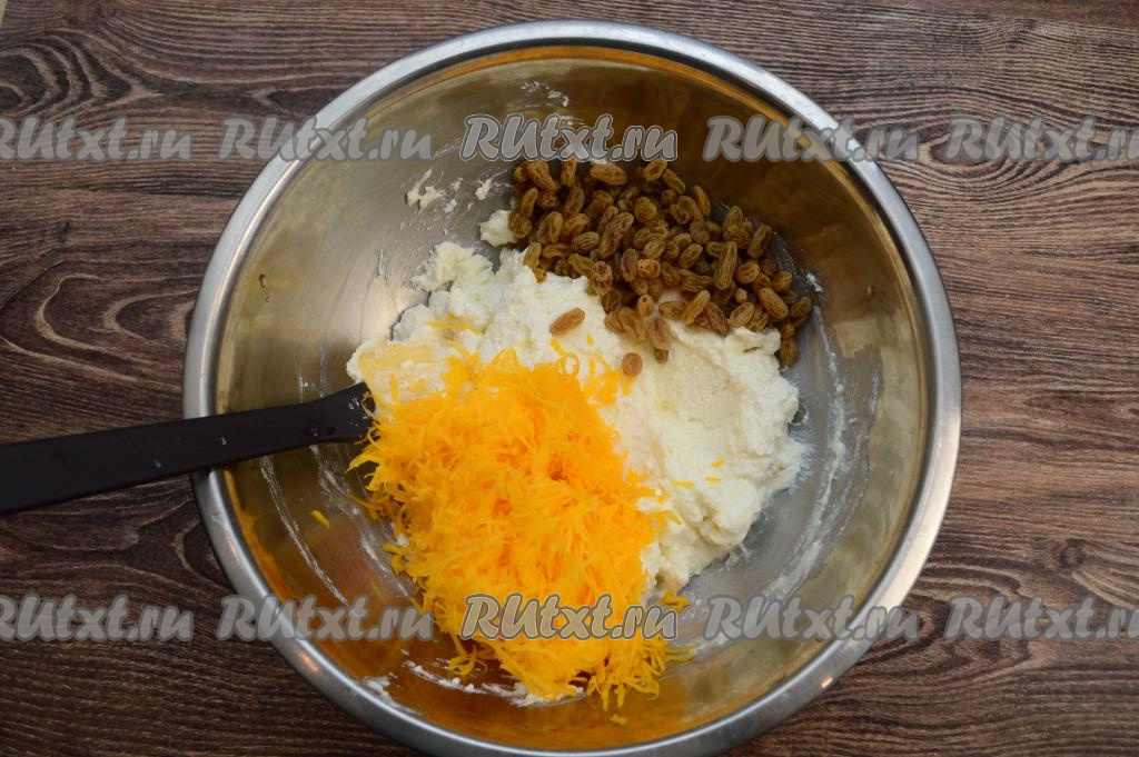 Тыкву очищаем от кожуры и волокон с семечками. 100 грамм очищенной тыквы натираем на мелкой тёрке и вместе с обсохшим изюмом выкладываем в миску с творожной массой.