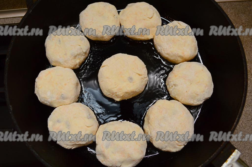В сковороде хорошо прогреваем растительное масло, после этого выкладываем сырники с тыквой и изюмом, уменьшаем огонь до среднего. Жарим минуты 3 (до подрумянивания сырников снизу).