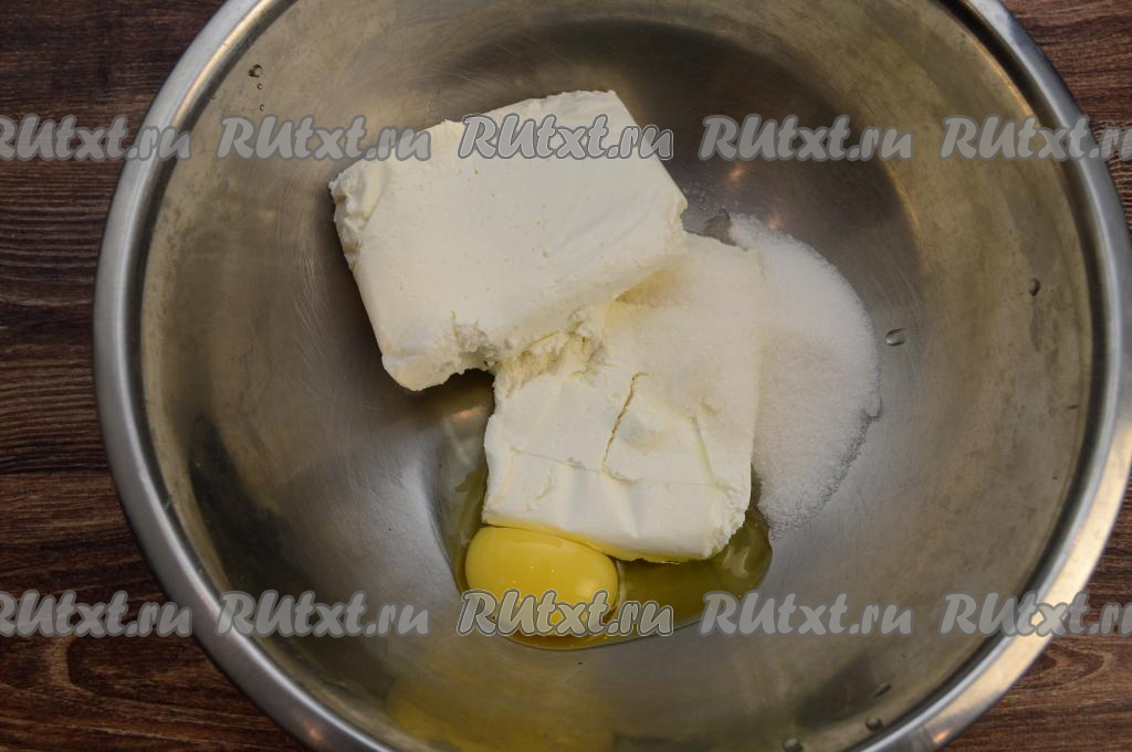 В глубокую миску выкладываем сахар, творог и сырое яйцо.