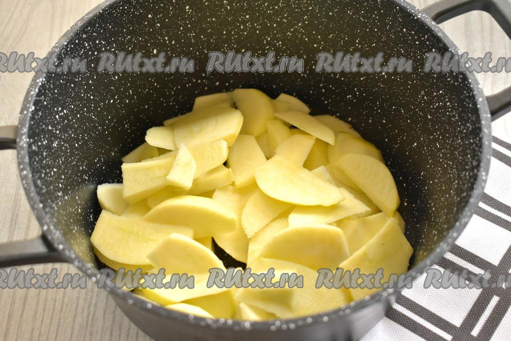 Очищаем яблоки от кожуры и семенных коробочек с семечками. Нарезаем яблоки на небольшие ломтики, перекладываем в кастрюлю с толстым дном.