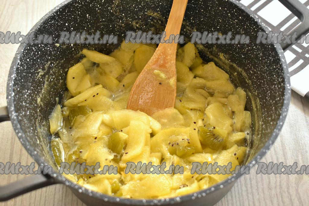 Перемешиваем содержимое кастрюли и оставляем на 1 час. За это время яблоки с киви нужно будет перемешать 2-3 раза.