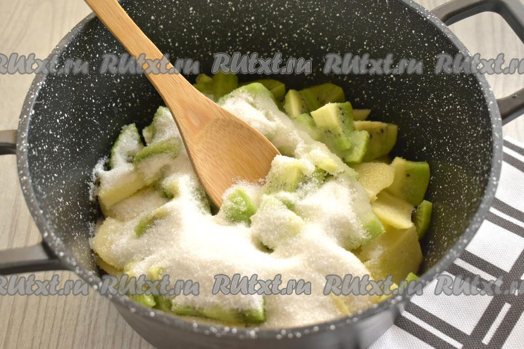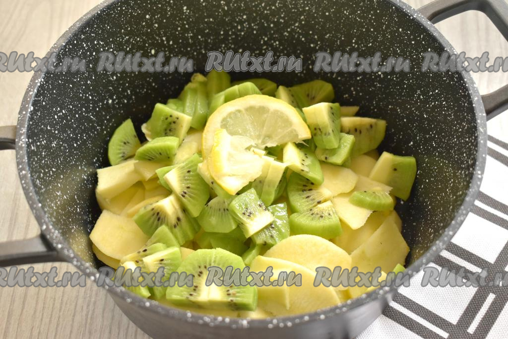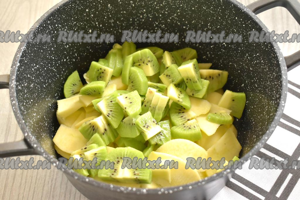 Очищаем киви от шкурки. Нарезаем очищенные киви на небольшие кусочки и добавляем в кастрюлю с яблоками.