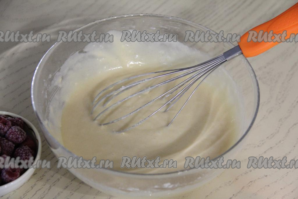 Перемешать тесто венчиком, оно получится в меру густым, напоминающим тесто на оладьи.
