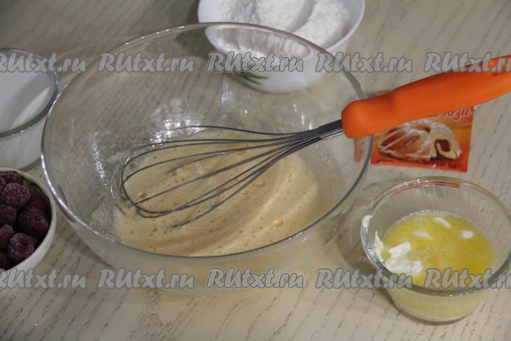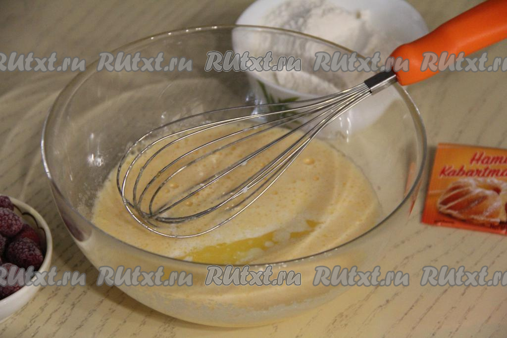 Взбить содержимое миски венчиком до однородности (ориентировочно на взбивание потребуется 2 минуты). Сливочное масло растопить (я растопила в микроволновке), дать ему немного остыть.