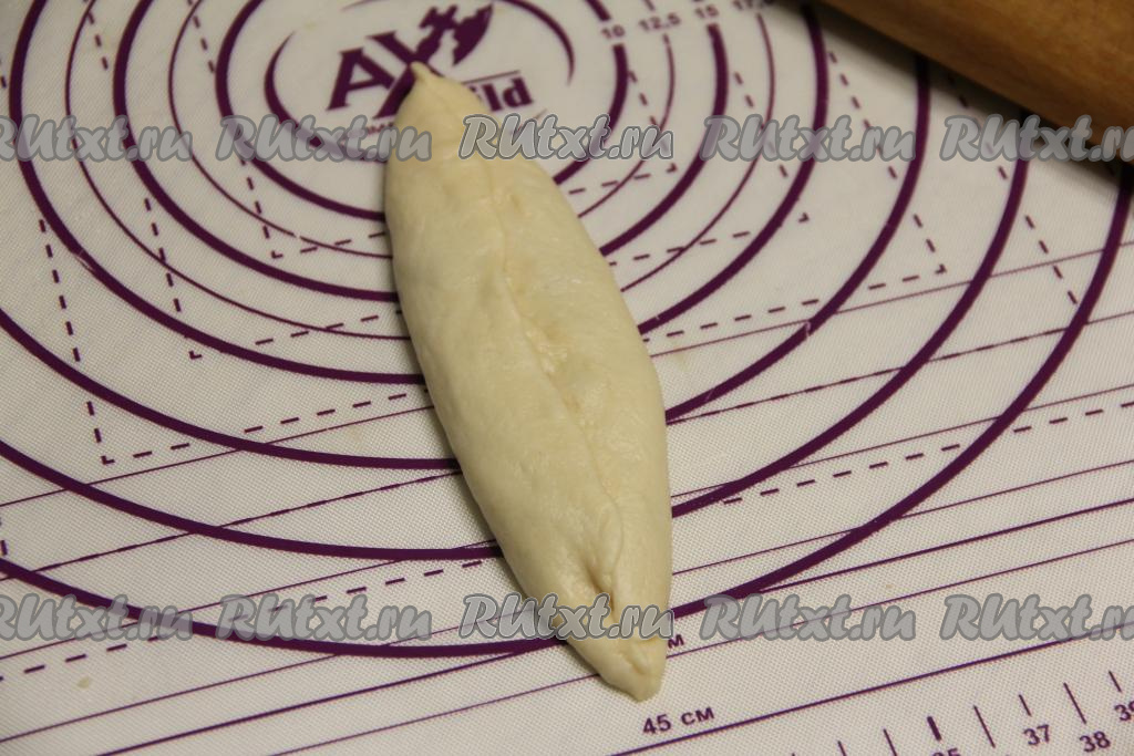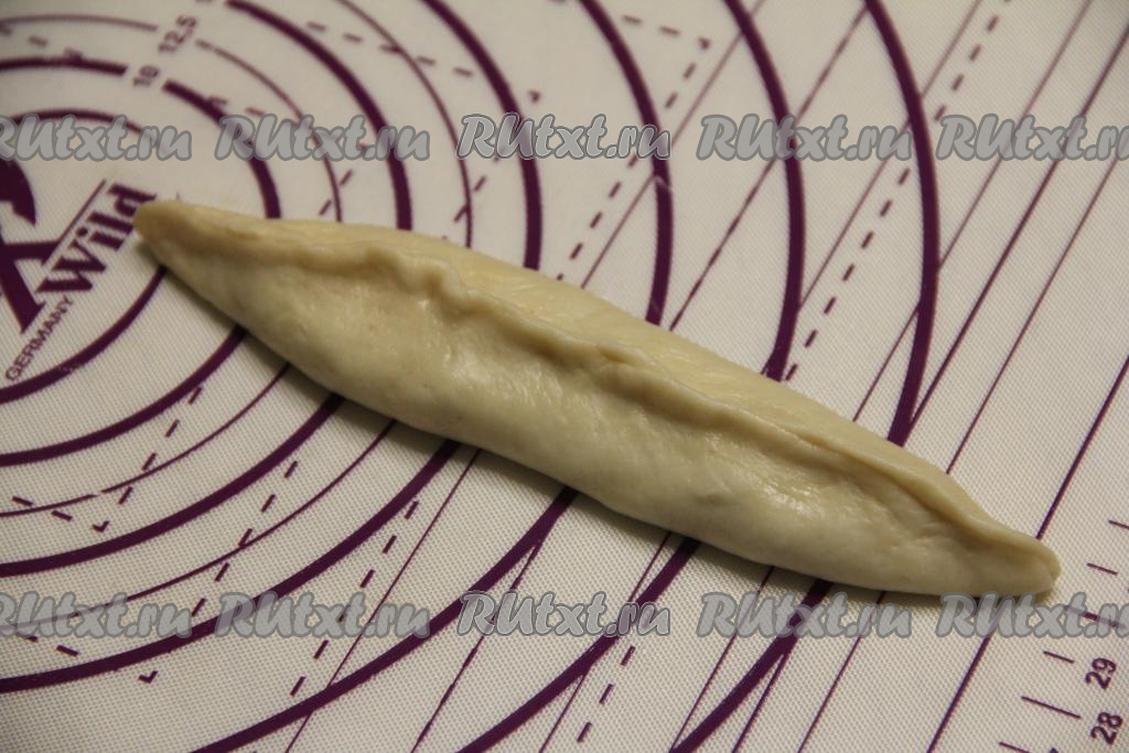 Аккуратно раскатать заготовку булочки, чтобы она стала более плоской.