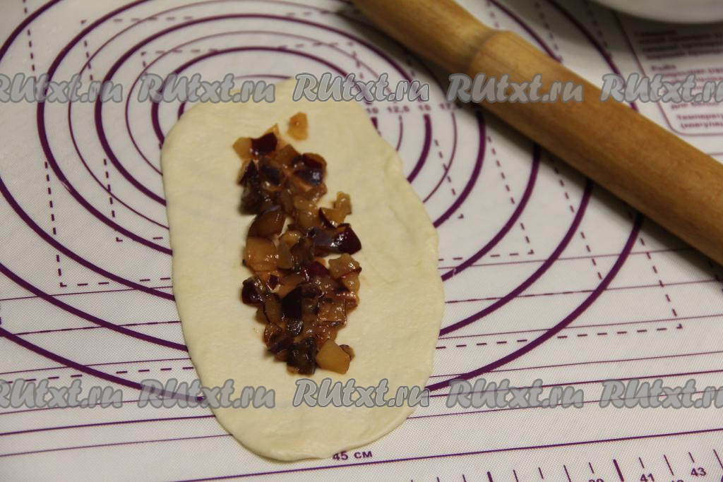 Разделить тесто на 8 частей. Каждую часть теста на присыпанной мукой поверхности раскатать в тонкий овал. В середину овала выложить 2 чайных ложки сливовой начинки.