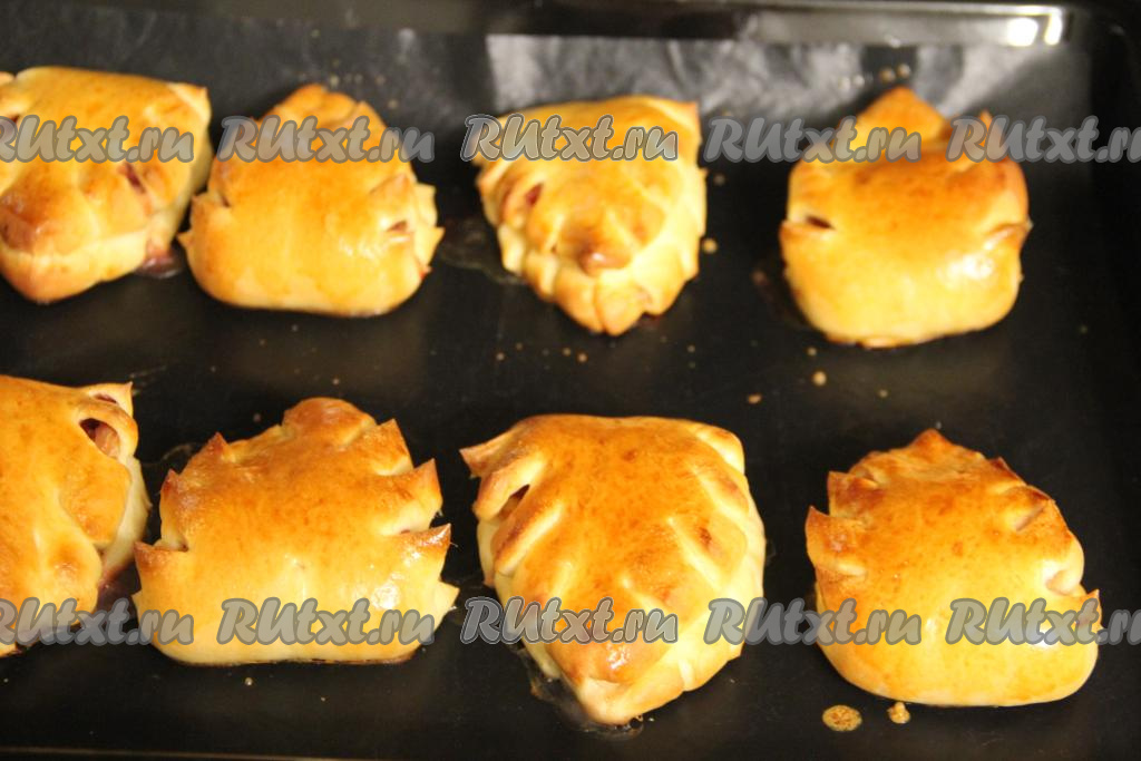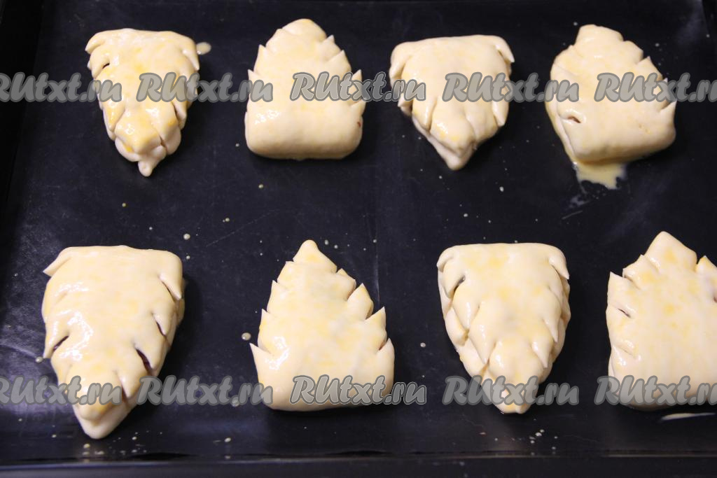 После расстойки с помощью ножниц сделать небольшие разрезы по краю булочек, придав им форму листика с дерева. Сырой яичный желток размешать вилкой в однородную массу, а затем смазать желтком поверхность булочек при помощи кулинарной кисти.