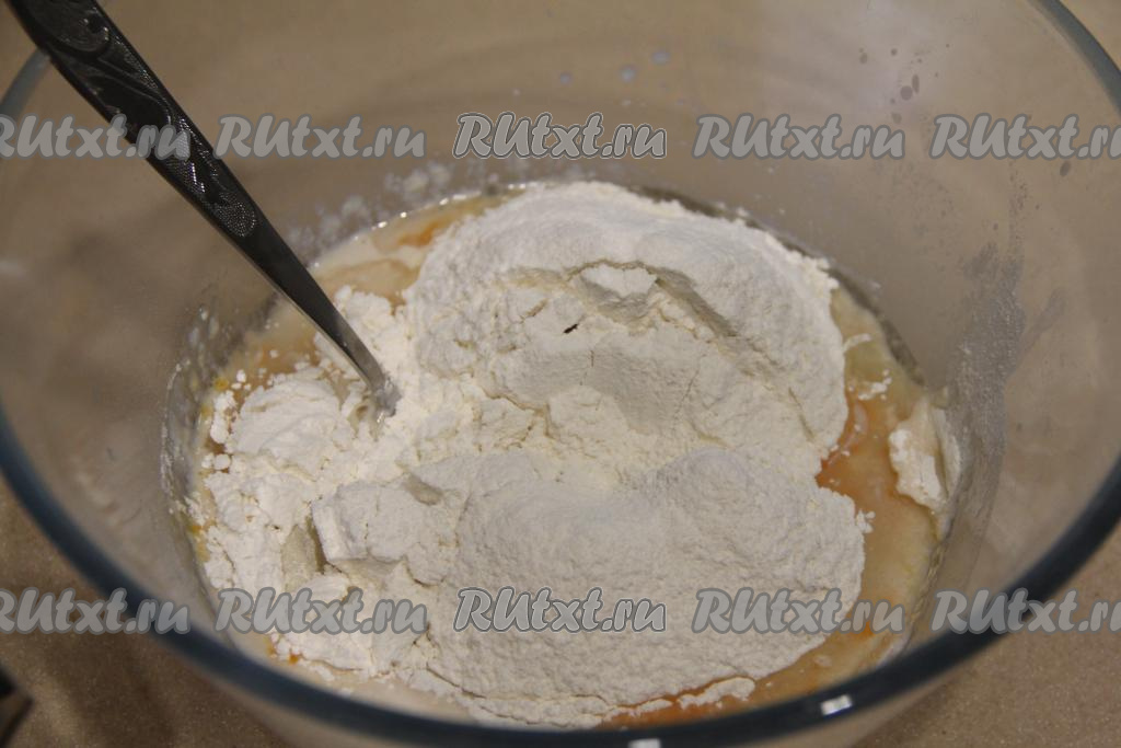Муку просеять в отдельную ёмкость. Всыпать половину просеянной муки в миску со смесью опары, масла и сахара, перемешать тесто ложкой. Затем небольшими порциями добавлять оставшуюся муку, каждый раз тщательно вмешивая её в дрожжевое тесто. Как только тесто начнёт собираться в ком, продолжать вымешивать его руками.