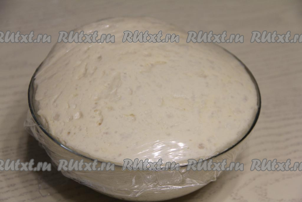 Оставить тесто в миске в тёплом месте на 1 час, накрыв миску плёнкой (или полотенцем). Тесто хорошо поднимется и увеличится в объёме раза в 2-3.
