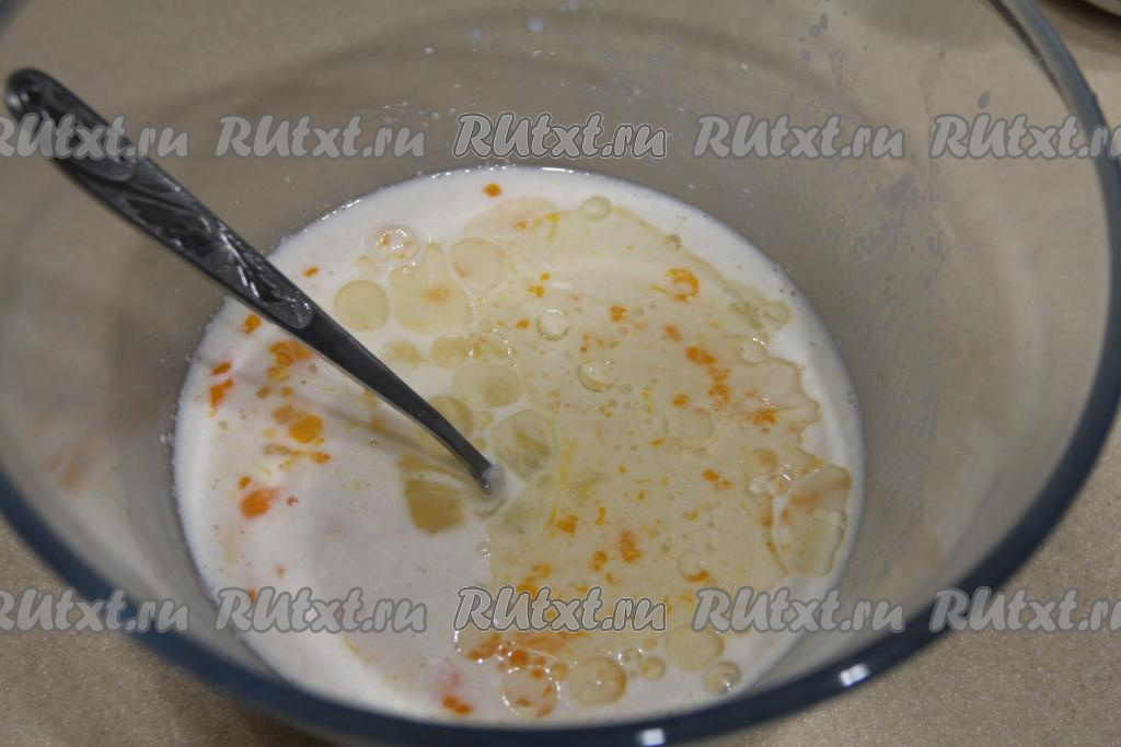 По прошествии 10 минут на поверхности опары образуется пенная шапочка, это значит, что дрожжи начали работать. Влить в запенившуюся опару растительное масло, добавить яйцо, соль и 1 столовую ложку сахара, перемешать.