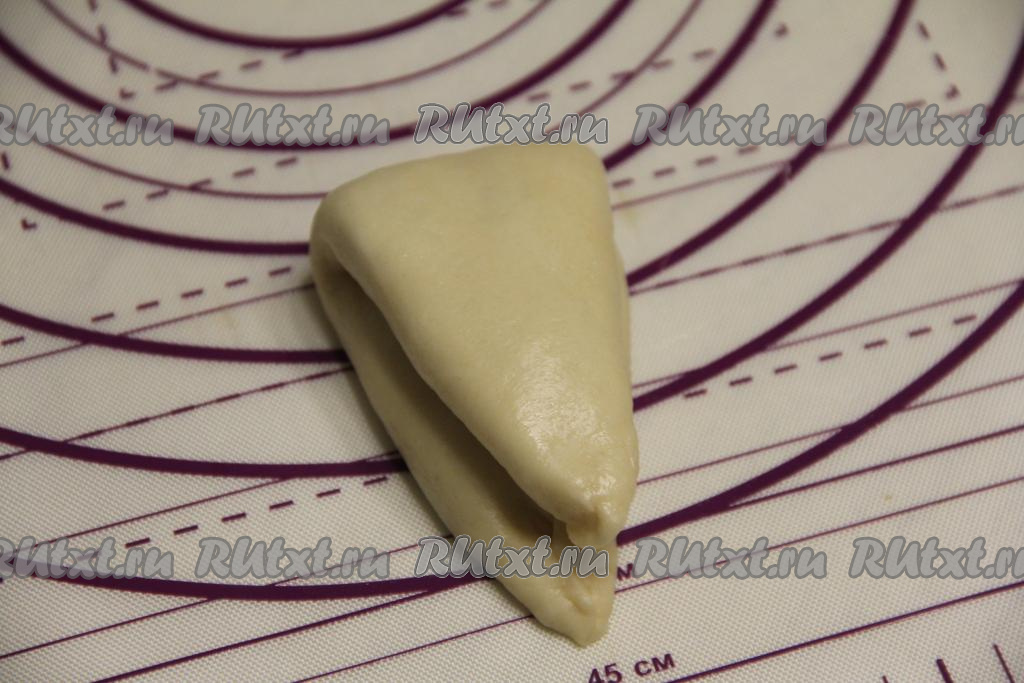 Свернуть булочку вдвое. Получится вот такая треугольная булочка с начинкой. Аналогично из дрожжевого теста сформировать оставшиеся 7 заготовок булочек со сливами.