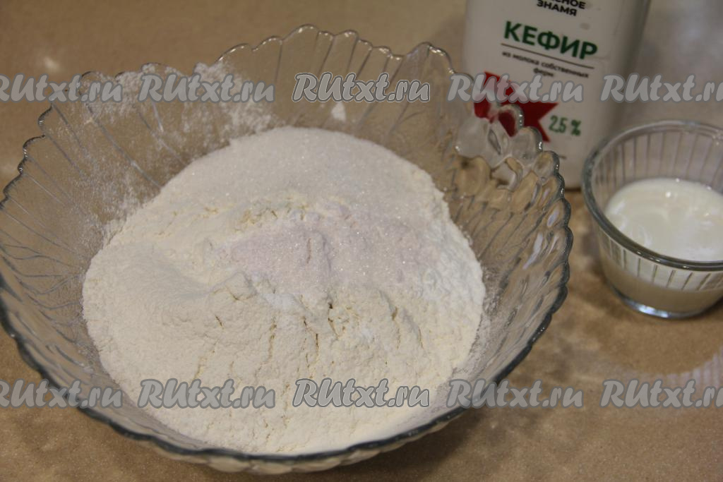 В глубокой миске соединить просеянную муку, соль, сахар, разрыхлитель и ванильный сахар, перемешать.