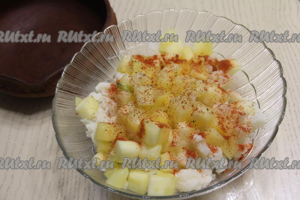 Перемешать овощи со специями, после этого переложить в жаропрочную форму.