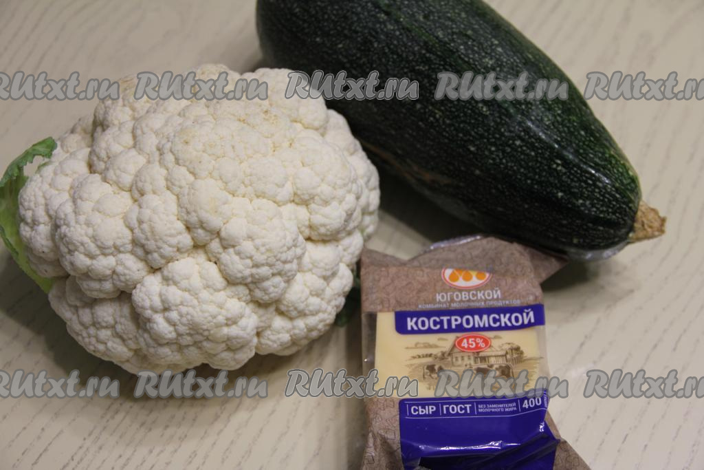 Накрыть форму фольгой и поставить в разогретую до 180 градусов духовку. Запекать цветную капусту с кабачками 30 минут. Затем снять фольгу, присыпать овощи сыром, натёртым на крупной тёрке, и, не накрывая фольгой, поставить в духовку на 10 минут (сыр должен полностью расплавиться).