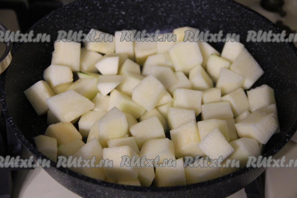 Кабачок вымыть, снять шкурку. Если у кабачка крупные косточки, их нужно будет удалить вместе с мякотью. 400 грамм кабачка нарезать на кубики со стороной 1 сантиметр. Разогреть растительное масло в сковороде, после этого выложить нарезанные кабачки.