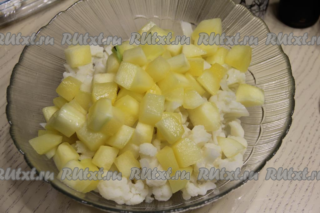 Обжарить кабачки в течение 7-8 минут, убрать с огня, дать немного остыть. В объёмной миске соединить варёную цветную капусту и обжаренные кабачки.