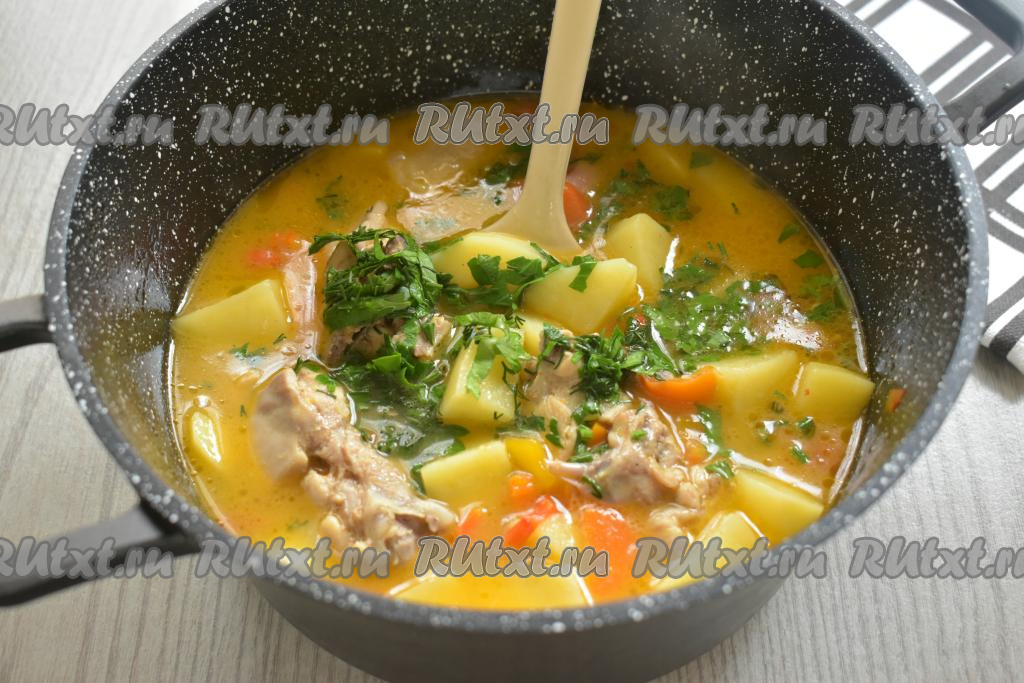 На достаточно сильном огне даём воде закипеть, накрываем кастрюлю (или сковороду) крышкой, уменьшаем огонь до минимума и тушим курицу с тыквой и картошкой минут 30 (овощи должны стать достаточно мягкими, они будут легко прокалываться ножом). Затем посыпаем блюдо мелко нарезанной зеленью, перемешиваем, даём закипеть и убираем с огня.