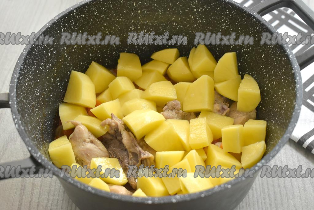 Очищенный картофель нарезаем на средние кубики, выкладываем к курице и овощам.