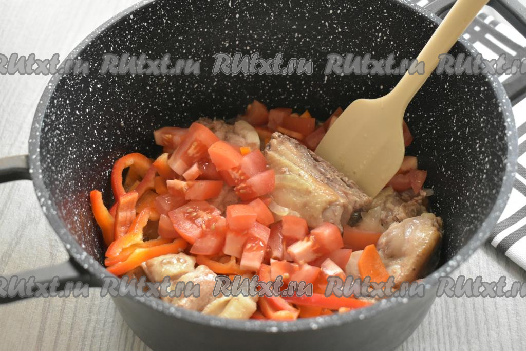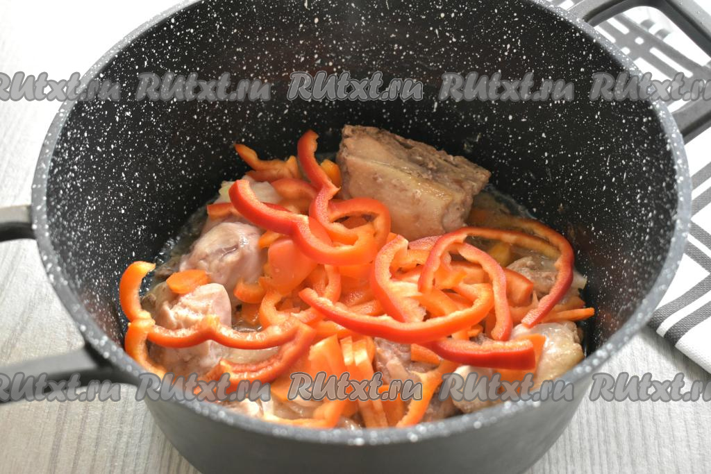 Выкладываем болгарский перец, очищенный от семян с плодоножкой и нарезанный на полукольца, перемешиваем.