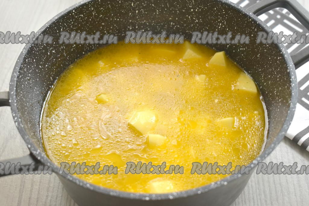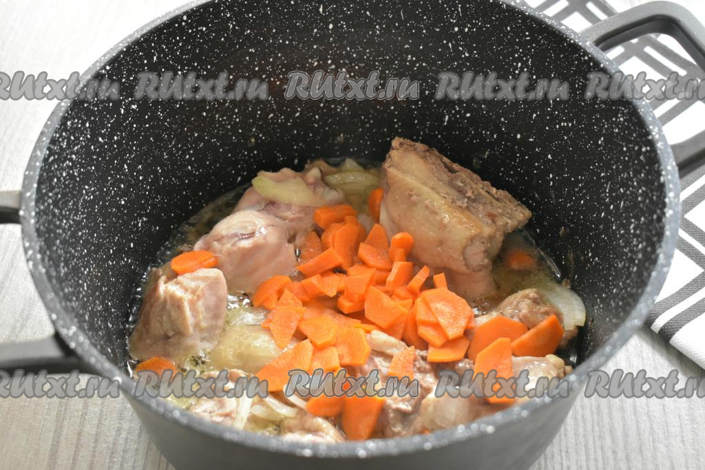 Сразу же добавляем очищенную морковку, нарезанную на достаточно тонкие полукружочки (или кружочки).