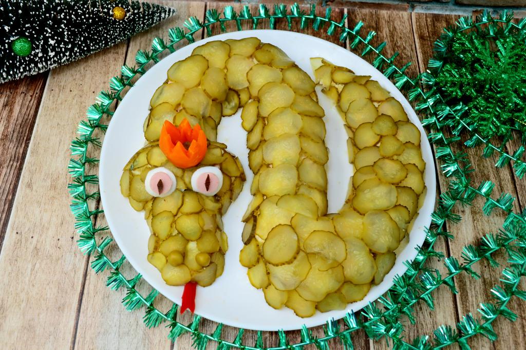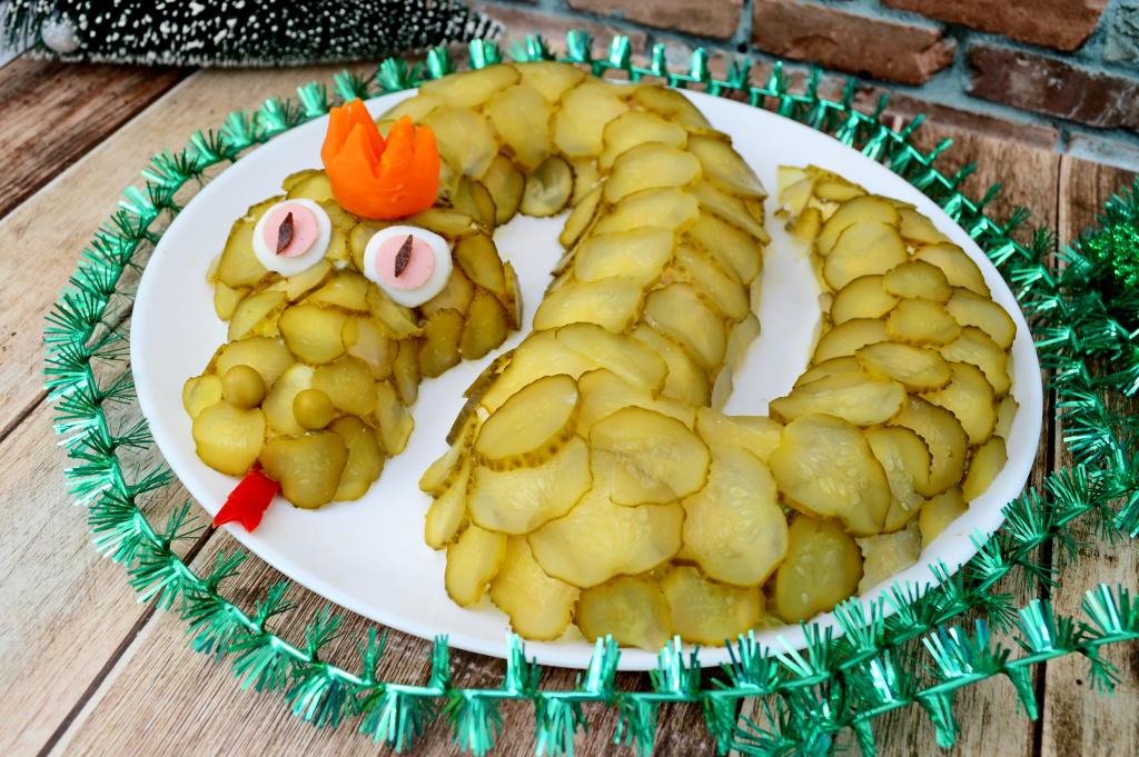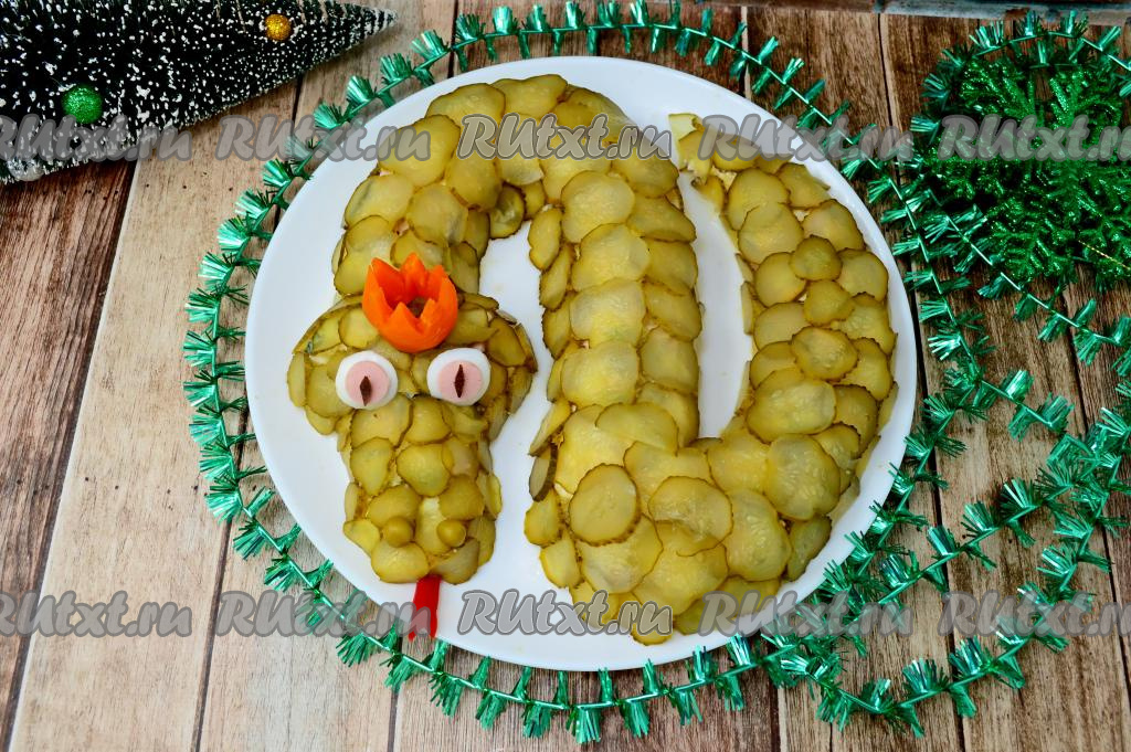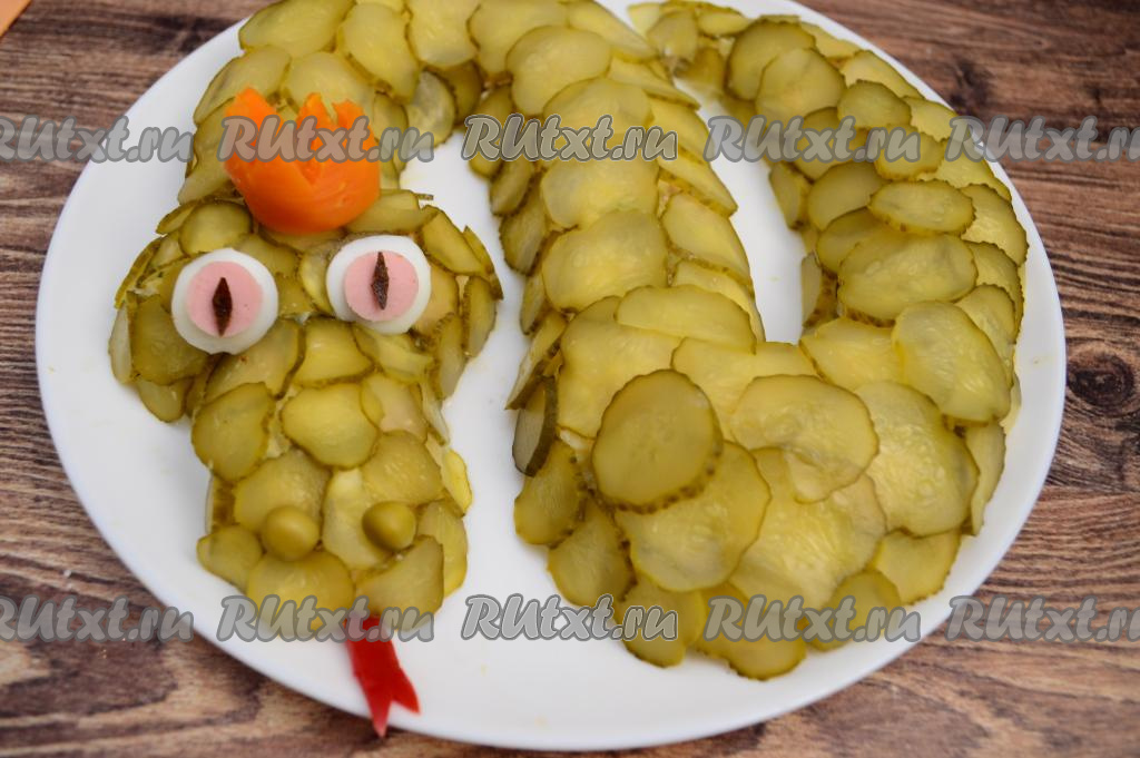 Обложить всю змею кружочками огурца, имитируя чешую.