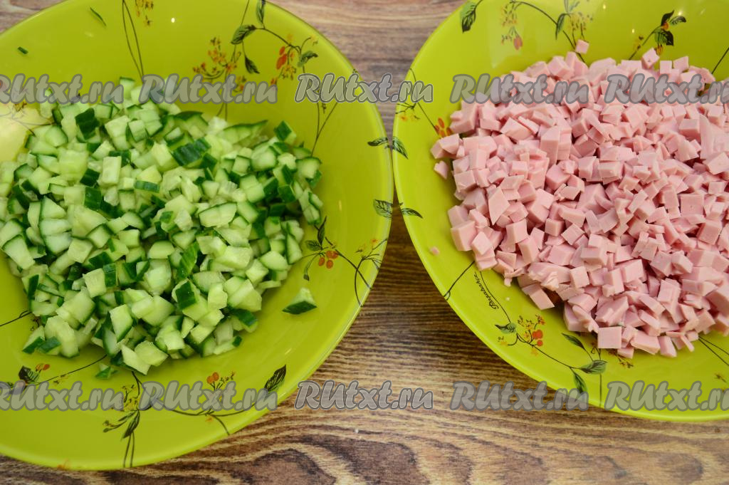 Свежий огурец вымыть, обсушить, при желании можно снять с него кожуру (я кожуру оставила). С варёной колбасы снять оболочку. Отрезать небольшой тонкий ломтик колбасы и отложить в сторону для украшения салата. Нарезать огурец и оставшуюся колбасу на мелкие кубики.